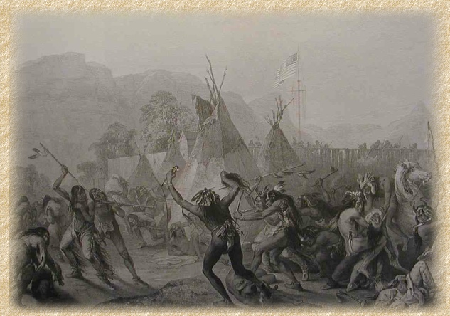 Attack of the Assiniboine. White traders generally chose not to become involved in Indian wars and battles preferring to maintain neutrality rather than risk offending or alienating a tribe (of potential customers). Early one morning on August 28, 1833 a party of about 600 Assiniboine warriors attacked an encampment of about thirty Piegan lodges situated outside the palisades at Fort McKenzie. When the attack began, there was initially an assumption by the traders that the Blackfeet were attacking the fort, but it quickly became clear that this was an Indian battle. Although fur companies generally tried to remain neutral in Indian/Indian conflicts, personnel from Fort McKenzie on this occasion did provide assistance to the Blackfeet because the Assiniboine were far out of their normal range, and never traded at Fort McKenzie (although they did trade at the company’s Fort Union post). The Blackfeet were sheltered within the fort, given supplies of powder and ball, and the wounded were given aid. A number of men and engages, including Culbertson, Mitchell, Harvey and even Maximilian took up arms along side the Blackfeet against the Assiniboine. Below is a drawing by Karl Bodmer of the early morning assault by the Assiniboine.