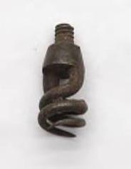 Gun Worm: The barrel of rifles and muskets fouled quickly with the solid residues produced by burning black powder. A gun worm was used to clean the barrel. The worm is nothing more than one or two twisted tines which can be threaded onto the end of the ram-rod. Wet tow or flax fiber is wound into the worm which is then moved up and down the barrel loosening and removing the solid residues. The process was repeated until the tow or flax fiber remained clean, then clean dry tow or flax fiber was used to dry the interior of the barrel.